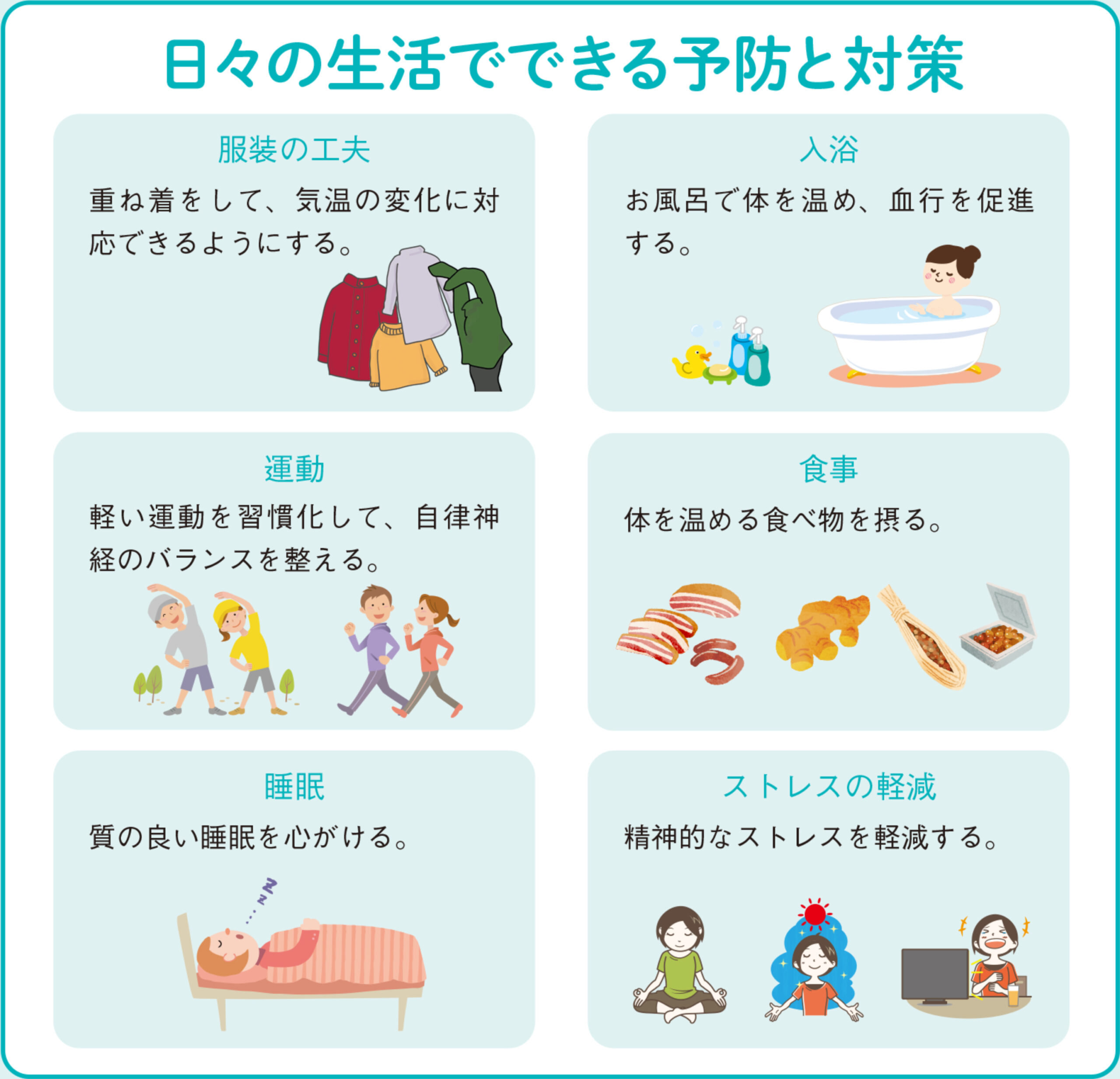 主に季節の変わり目や、日中と夜間の気温差が激しい時に、体が気温の変化に適応できずに起こります。 自律神経が乱れて体温調節がうまくできなくなることで、以下のような様々な症状が現れます。